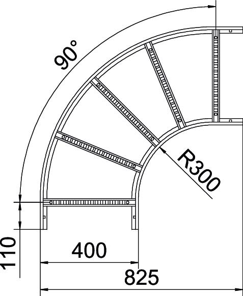 Bogen 90° horizontal mit geschweißter Sprosse für alle Kabelleitertypen mit der Seitenhöhe 110 mm.