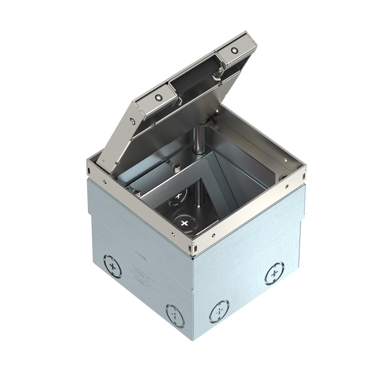 Quadratische Bodensteckdose für den Einsatz in trocken gepflegten Hohlböden und Estrichböden im Innenbereich. Einbaugehäuse mit vorgeprägten Einführungsöffnungen für Rohre (M20/M25). Oberteil durch 4 Nivellierstützen auf Oberkante Bodenbelag einstellbar. Die Mindesteinbautiefe beträgt 110 mm, der Nivellierbereich + 25 mm.