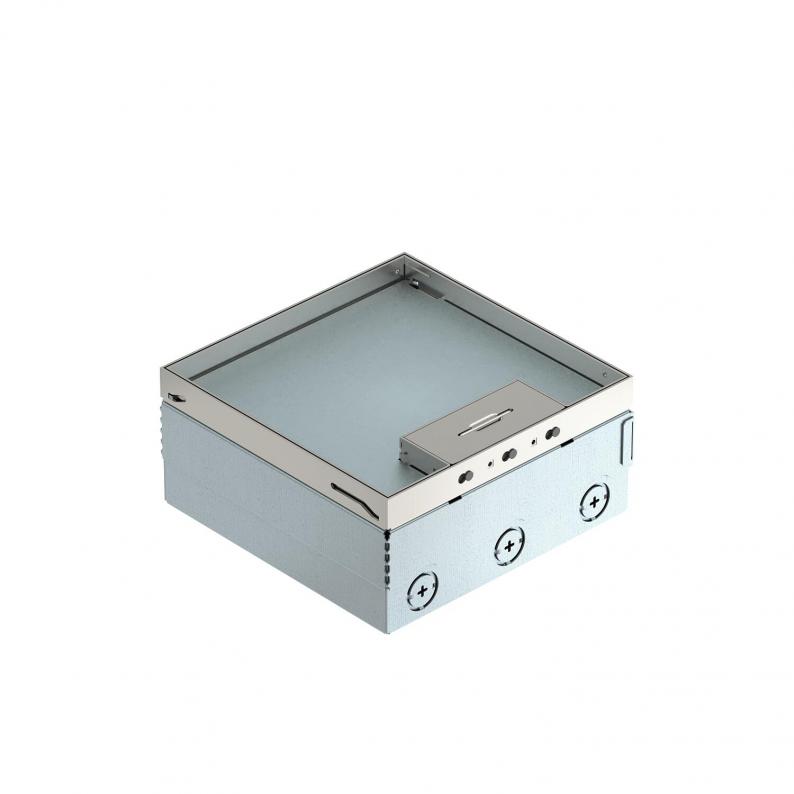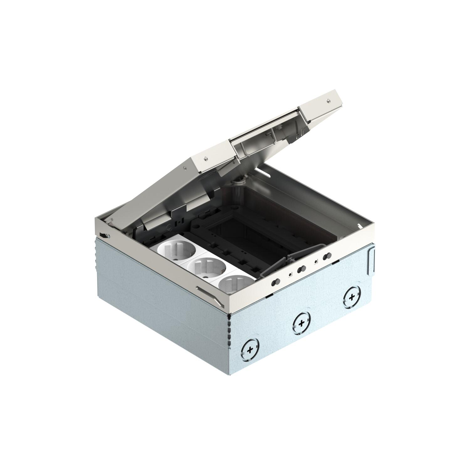 Quadratischer Bodentank für den Einsatz in trocken gepflegten Hohlböden und Estrichböden im Innenbereich. Einbaugehäuse mit vorgeprägten Einführungsöffnungen für Rohre (M25). Mit 2 Universalträger UT3 45 3 und einer 3-fach Schutzkontaktsteckdose. Oberteil durch 4 Nivellierstützen auf Oberkante Bodenbelag einstellbar. Die Mindesteinbautiefe beträgt 95 mm, der Nivellierbereich + 30 mm.