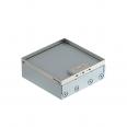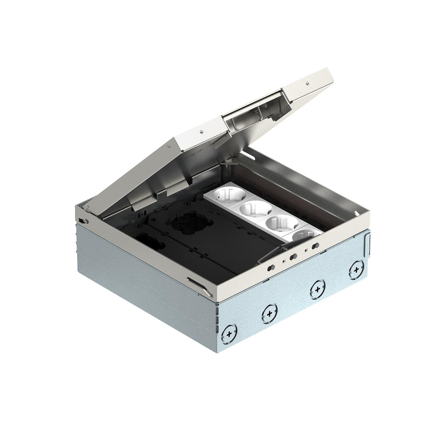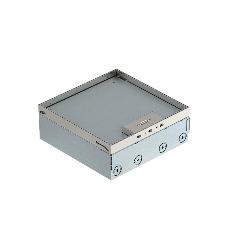 Quadratischer Bodentank für den Einsatz in trocken gepflegten Hohlböden und Estrichböden im Innenbereich. Einbaugehäuse mit vorgeprägten Einführungsöffnungen für Rohre (M25). Mit 3 Universalträgern UT4 und zwei 2-fach Steckdosen. Oberteil durch 4 Nivellierstützen auf Oberkante Bodenbelag einstellbar. Die Mindesteinbautiefe beträgt 95 mm, der Nivellierbereich + 30 mm.