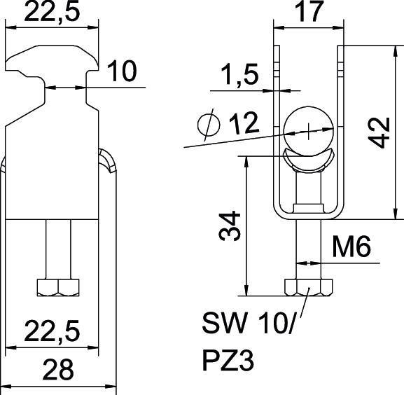 Bügelschelle mit Hammerkopf-Fuß, Metalldruckwanne mit gerundeten Kanten für Kabelschutz. Zur vertikalen und horizontalen Montage von 1 Einzelkabel an C-Profilschiene. Für Schlitzweite 16 - 17 mm. Mit 1-gängiger Schraube an Druckwanne, universeller Sechskant-Schraubenkopf SW10, mit Schlitz und Kreuzschlitz. Geeignet für Montage im Innen-und Außenbereich. Gegenwanne muss separat bestellt werden.