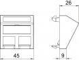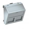 Datentechnikträger mit schrägem Auslass und Verschlussschieber zur Aufnahme von zwei Datentechnik-Anschlussmodulen mit RJ45-Buchse. Die Rastbefestigung eignet sich für den waagerechten und senkrechten Einbau in die Systemumgebung. Typ RM hat eine spezielle Modulaufnahme und ist für eine indirekte Befestigung der Daten-Anschlussmodule in der Montageöffnung ausgelegt.