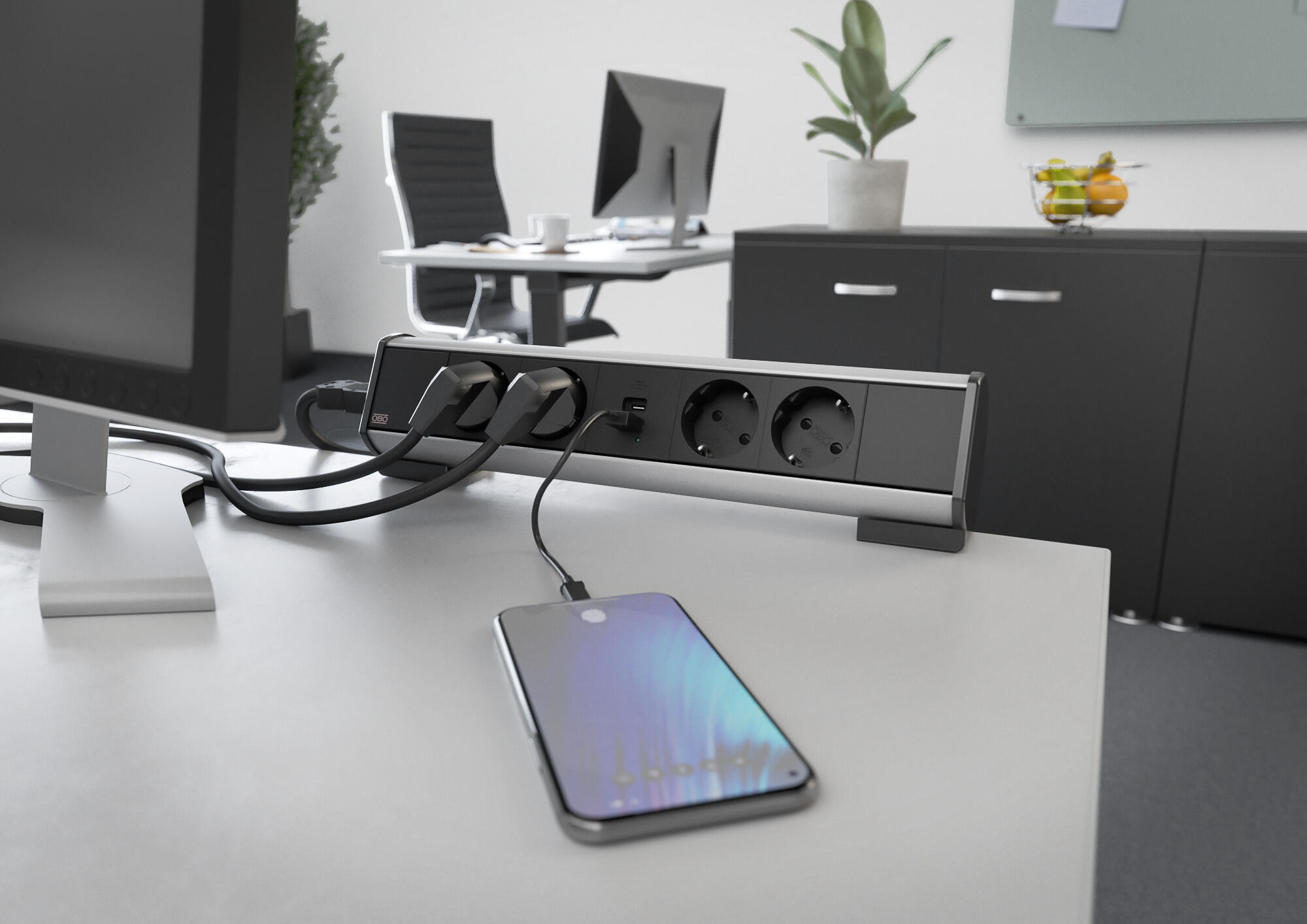 - Unmittelbarer Zugriff auf Strom-, Daten- und Multimediaanschlüsse – dank werkzeugloser Montage direkt auf dem Schreibtisch