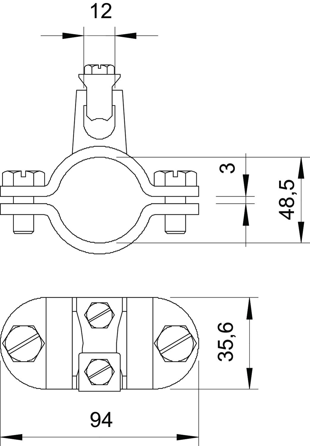 • Schellenoberteil mit angegossener Klemmstelle aus Zinkdruckguss, Schellenunterteil aus Stahl, feuerverzinkt