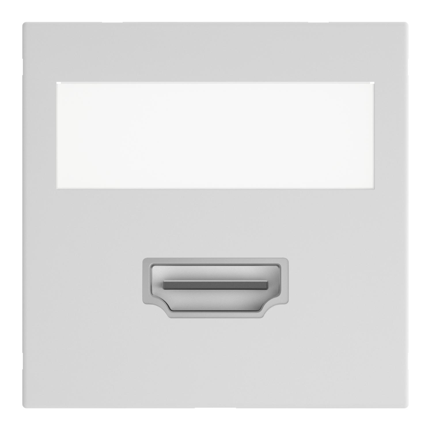 Multimediaträger mit einer HDMI-Anschlussbuchse, Kabelauslass gerade, mit Beschriftungsfeld, HDMI-Buchse mit Schraubanschluss. Trägerplatte mit Rastbefestigung, geeignet für den waagerechten und senkrechten Einbau in die Systemumgebung.