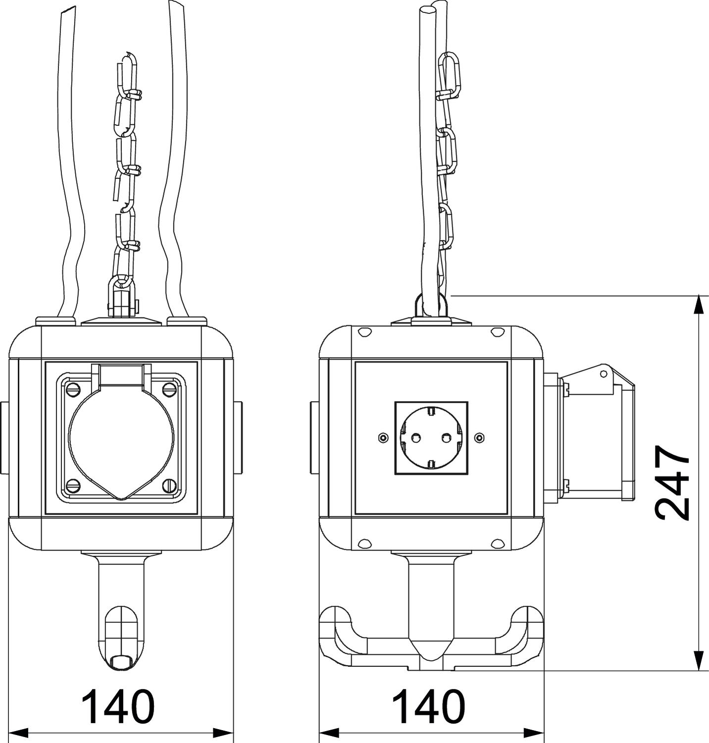 3 x 1-fach-Schutzkontaktsteckdosen 16 A/250 V mit erhöhtem Berührungsschutz, auf einen Wechselstromkreis vorverdrahtet, Anschluss über 1 x Klemme 3-polig, 1 x CEE-Steckdose 16 A/415 V, mit Trennwand zur Stromkreistrennung.