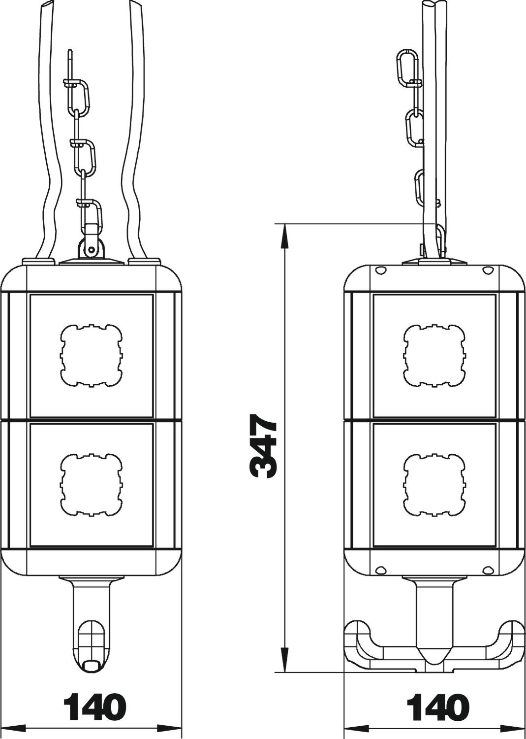Leergehäuse mit Aufhängeöse und Griffhaken, zum Einbau von 8 elektrischen Betriebsmitteln, mit beigelegter Trennwand. Mit 8 Abdeckplatten für Installationsgeräte mit UP-Tragring oder Tragebügel.
