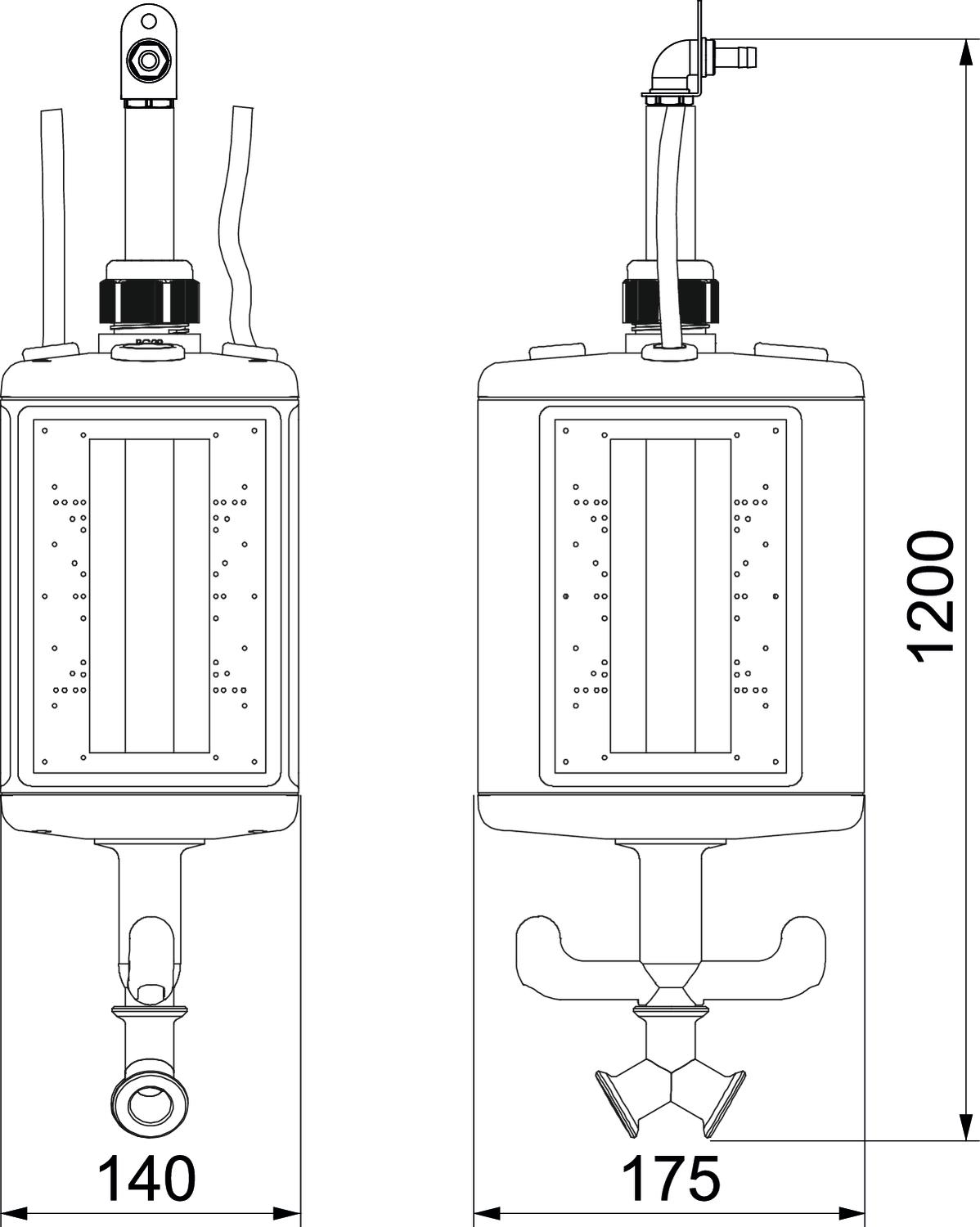 Leergehäuse mit 1 m Rohr 1/2” und Anschluss für Druckluftschlauch 13 x 3,5 mm und 2-Wege-Verteiler 1/2”. Mit Aufhängeöse und Griffhaken, zum Einbau von elektrischen Betriebsmitteln, mit beigelegter Trennwand. Ohne Abdeckplatten. Zur Versorgung von Arbeitsplätzen in nassen Bereichen. Schutzgrad: IP 44.