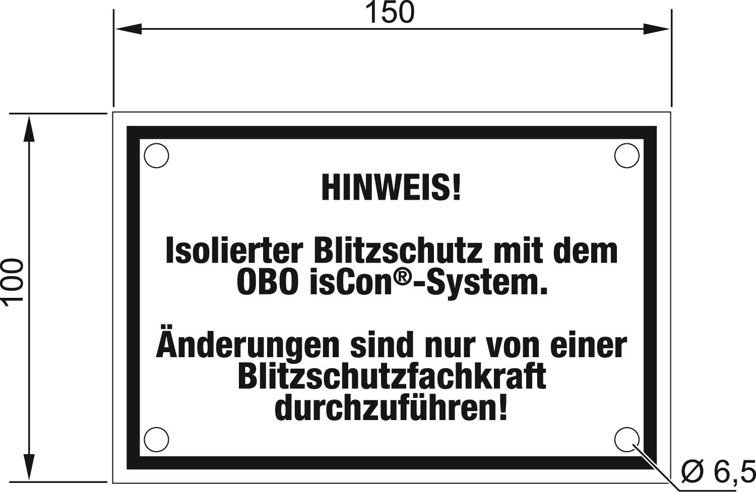 Aufdruck: "HINWEIS! Isolierter Blitzschutz mit OBO isCon®-System. Änderungen sind nur von einer Blitzschutzfachkraft durchzuführen"