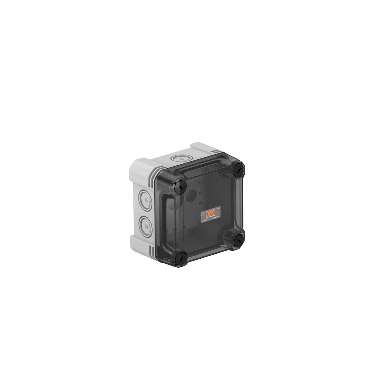 Kabelabzweigkasten zum Verbinden von Kabeln und Leitungen im Innen- und Außenbereich. Quadratische Form mit Ausschlageinführungen. Geeignet für die Wand-/ Deckenmontage mit der Möglichkeit zur Außenbefestigung, Innenbefestigung oder Montage über die Eckdome. Besonders schlagfest mit IK09. Transparenter Deckel mit Schnellverschluss, plombierbar. Hergestellt aus halogenfreien und UV-resistenten Materialien.