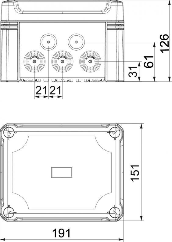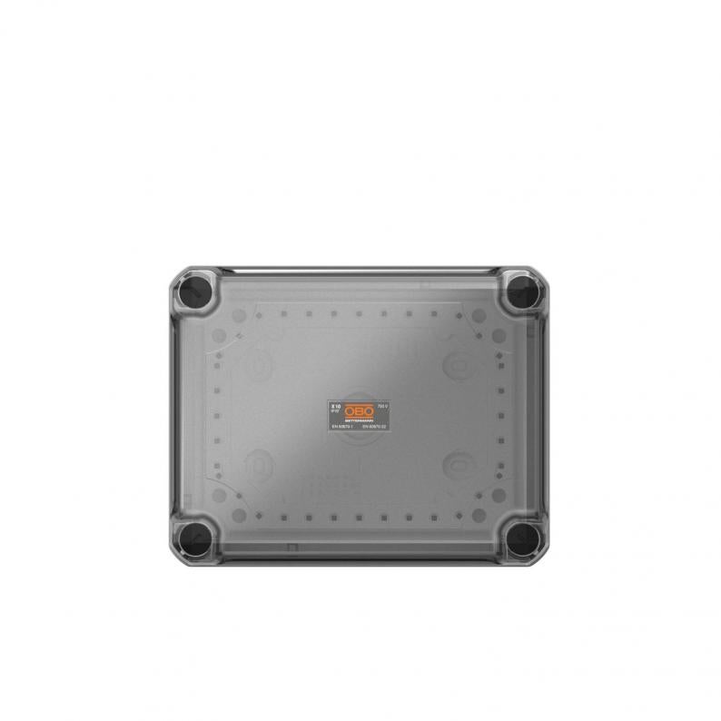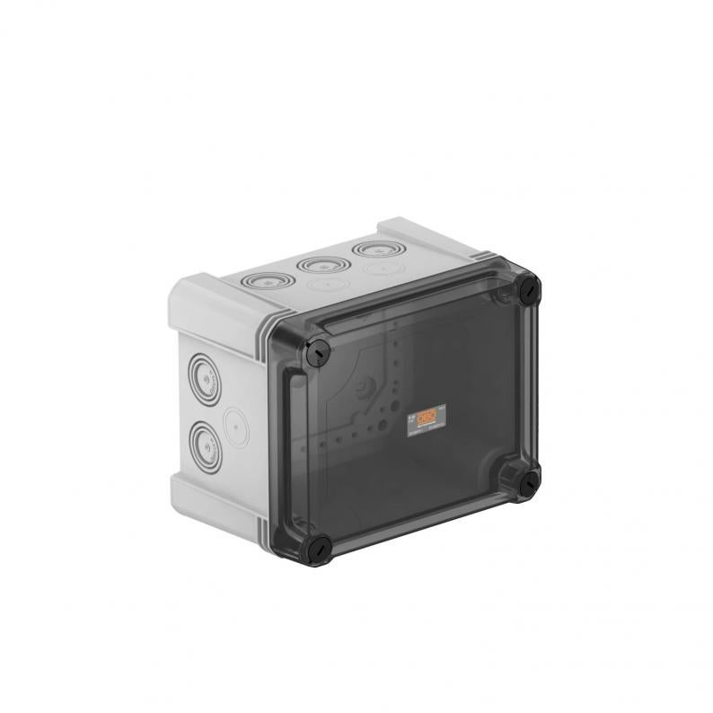 Kabelabzweigkasten zum Verbinden von Kabeln und Leitungen im Innen- und Außenbereich. Rechteckige Form mit Ausschlageinführungen. Geeignet für die Wand-/ Deckenmontage mit der Möglichkeit zur Außenbefestigung, Innenbefestigung oder Montage über die Eckdome. Besonders schlagfest mit IK09. Transparenter Deckel mit Schnellverschluss, plombierbar. Hergestellt aus halogenfreien und UV-resistenten Materialien.