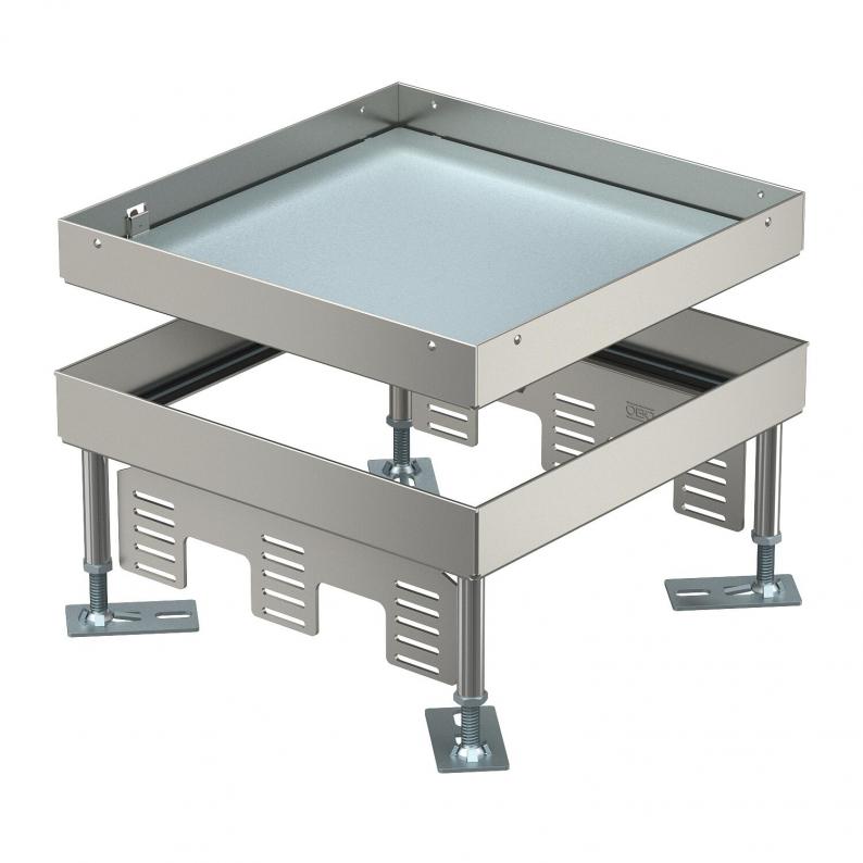 Nivellierbare quadratische Kassette Schwerlast "blind" in Nenngröße 9 für die Herstellung einer Revisionsöffnung. Einbau in Kanalsystemen, Doppel- und Hohlböden in trocken oder nass gepflegten Fußböden im Innenbereich. Belastungsklasse 1 bis 10 kN. Nur für glatte Bodenbeläge geeignet.