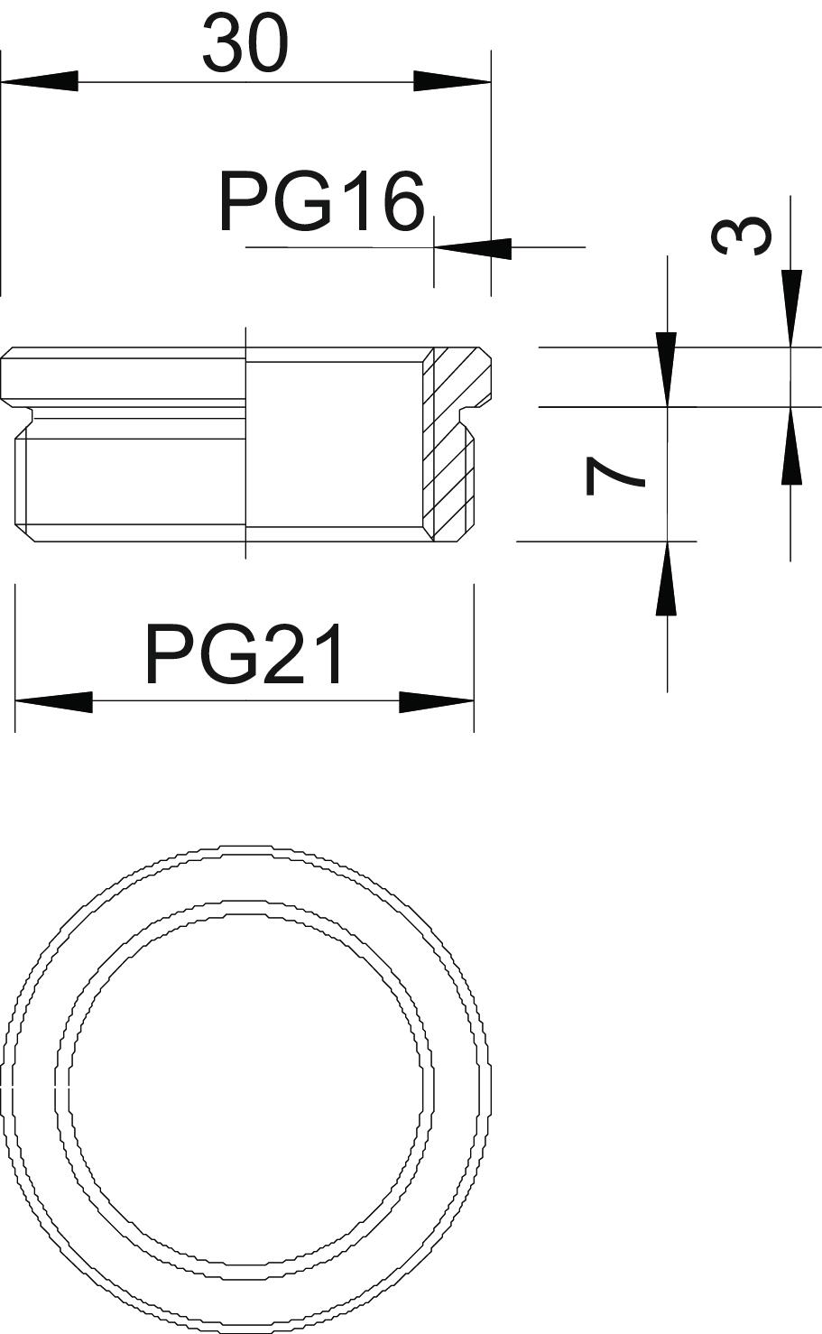 Reduktion (Teil H) nach DIN 46320, mit PG-Gewinde nach DIN 40430, zum Übergang von einem PG-Gewindeloch auf eine kleinere Kabelverschraubung.