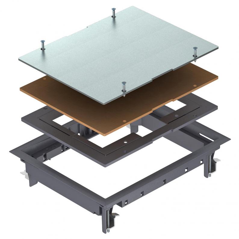 Zugdoseneinsatz zum Blindverschluss einer rechteckigen Montageöffnung der Nenngröße 6 in einem Unterflur-System oder Doppelboden im Innenbereich. Teppichschutzrahmen aus Polyamid.
