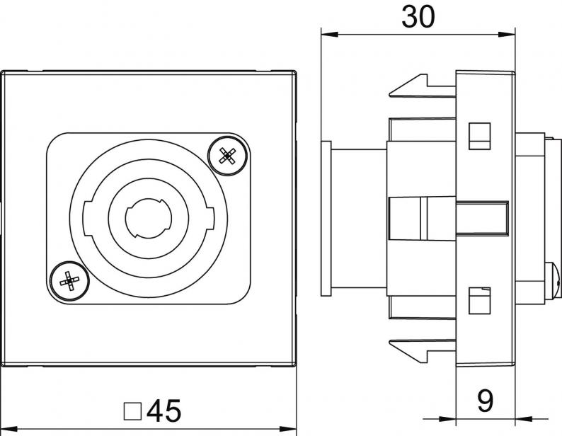 Multimediaträger mit einer Speakon-Anschlussbuchse, Kabelauslass gerade, ohne Beschriftungsfeld, Speakon-Buchse 4-polig mit Schraubanschluss. Trägerplatte mit Rastbefestigung, geeignet für den waagerechten und senkrechten Einbau in die Systemumgebung.