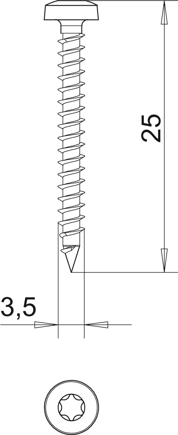 Stahl gehärtet, galvanisch verzinkt und hostaflonbeschichtet. Panhead mit T-Bit (Innensechsrund), die Gr. Ø 3 mm T10, Ø 3,5 mm T15, Ø 4 und 4,5 mm T20, Ø 5 mm T25.