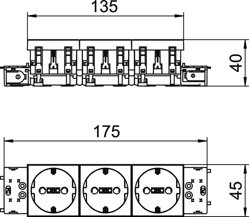 Schutzkontakt-Steckdose mit seitlichem Anschluss 3-fach 0°, mit erhöhtem Berührungsschutz, mit Steckklemmen, 2-polig, 16 A, 250 V~, mit Verbindungsklemmen nach IEC 60884-1, geeignet für den Einbau in Geräteeinbau-Kanalsysteme Rapid 45.