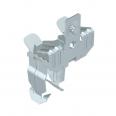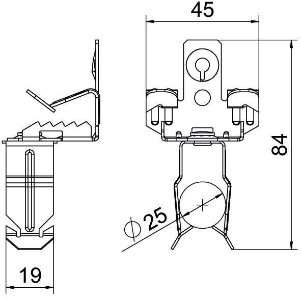 Trägerklammer zum Montieren von Rohren. Offene Rohraufnahme unten. Befestigung an Stahträgern durch Aufschlagen.