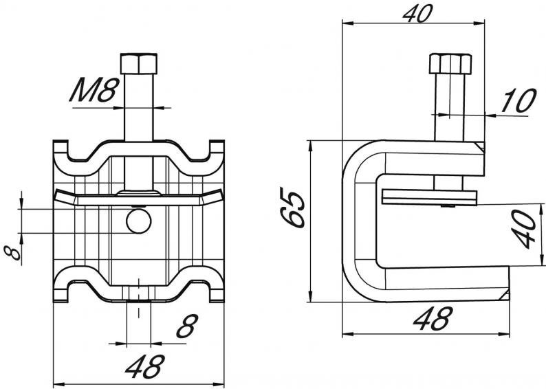 Diese Art Trägerklammer wird auf den Träger aufgeschoben und mittels einer Druckwanne und Schraube (M8) am Träger oder Flacheisen fixiert. Die Sechskantschraube hat eine Schlüsselweite von 10 mm. Im Schellenkörper sind außerdem zwei weitere M8 Gewinde eingebracht, um zum Beispiel Gewindestangen zu befestigen.