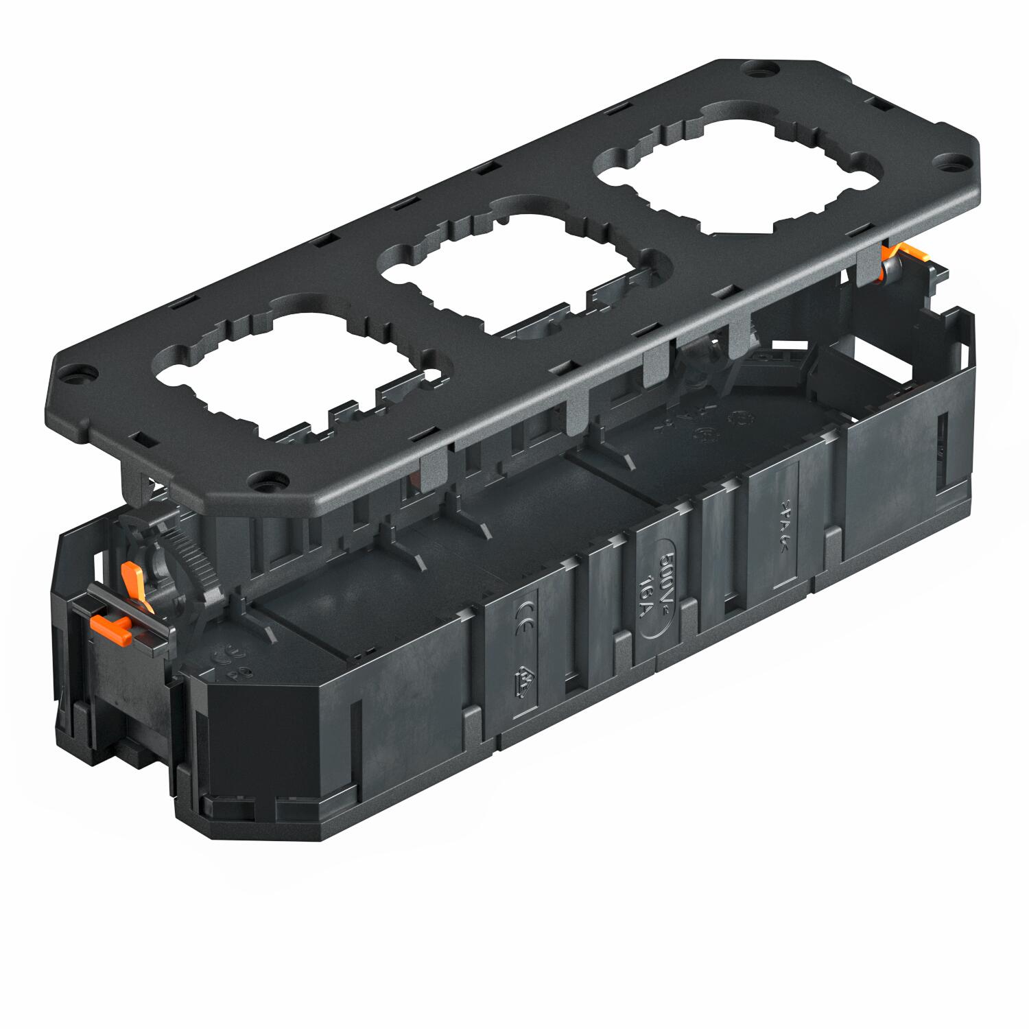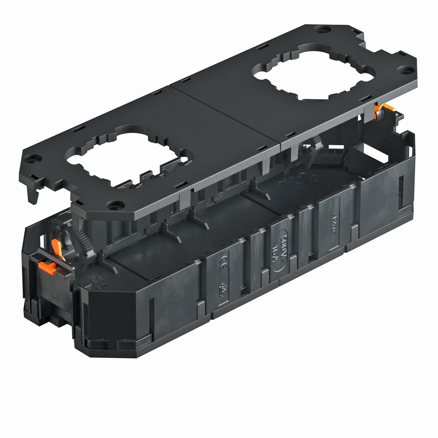 Universalträger mit zwei Zugentlastungen für Einbau von Elektroinstallation in Geräteeinbaueinheiten der Nenngrößen R7, R9 und 9.