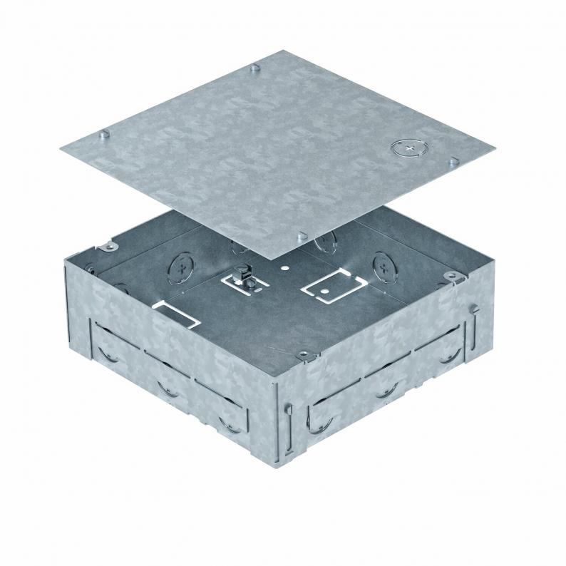Quadratisches Einbaugehäuse für einen Geräteeinsatz GES4-2 für den Einsatz in Estrichböden im Innenbereich. Mit vorgeprägten Einführungsöffnungen für Rohrleitungen (M25) auf allen vier Seiten.