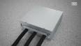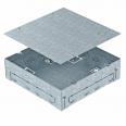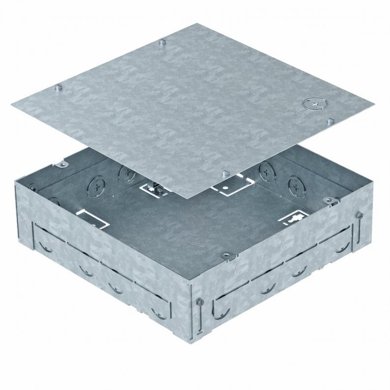 Quadratische Einbaugehäuse für einen Geräteeinsatz GES9-2 für den Einsatz in Estrichböden im Innenbereich. Mit vorgeprägten Einführungsöffnungen für Rohrleitungen (M25) auf allen vier Seiten.