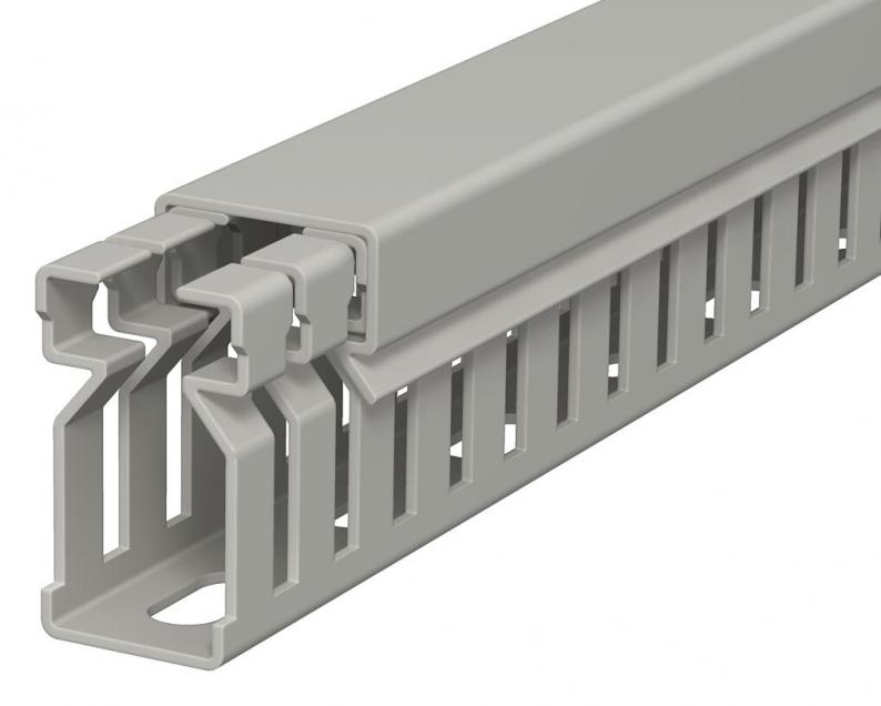 Verdrahtungskanal inkl. Oberteil und Bodenlochung zur waagerechten und senkrechten Verlegung elektrischer Kabel und Leitungen im Schaltschrank. Ausführung als metrischer Kanal. Das Nennmaß der Systemgröße entspricht dem Innenmaß der Kanäle. Das Ausbrechen der Stege erfolgt werkzeuglos. Bodenbündiges Ausführen ist durch Sollbruchstellen möglich. Geprüft nach DIN EN 50085-2-3. Sonderlängen auf Anfrage.