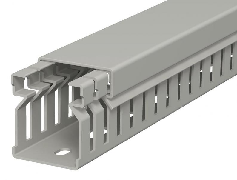 Verdrahtungskanal inkl. Oberteil und Bodenlochung zur waagerechten und senkrechten Verlegung elektrischer Kabel und Leitungen im Schaltschrank. Ausführung als metrischer Kanal. Das Nennmaß der Systemgröße entspricht dem Innenmaß der Kanäle. Das Ausbrechen der Stege erfolgt werkzeuglos. Bodenbündiges Ausführen ist durch Sollbruchstellen möglich. Geprüft nach DIN EN 50085-2-3. Sonderlängen auf Anfrage.