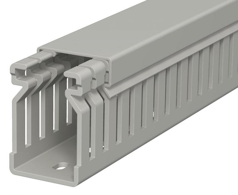 Verdrahtungskanal inkl. Oberteil und Bodenlochung zur waagerechten und senkrechten Verlegung elektrischer Kabel und Leitungen im Schaltschrank. Ausführung als metrischer Kanal. Das Nennmaß der Systemgröße entspricht dem Innenmaß der Kanäle. Das Ausbrechen der Stege erfolgt werkzeuglos. Bodenbündiges Ausführen ist durch Sollbruchstellen möglich. Geprüft nach DIN EN 50085-2-3. Sonderlängen auf Anfrage.