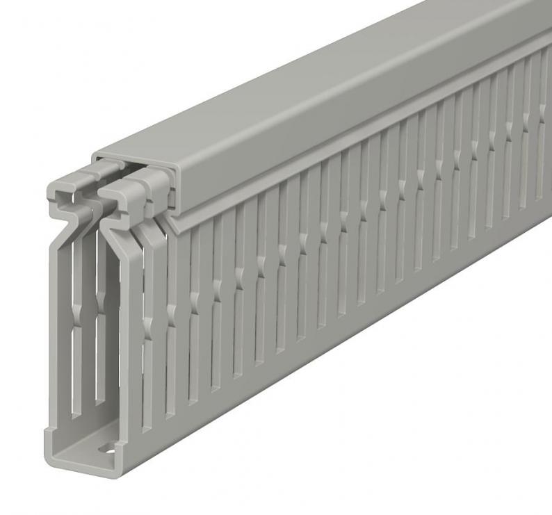 Verdrahtungskanal inkl. Oberteil und Bodenlochung zur waagerechten und senkrechten Verlegung elektrischer Kabel und Leitungen im Schaltschrank. Ausführung als metrischer Kanal. Das Nennmaß der Systemgröße entspricht dem Innenmaß der Kanäle. Das Ausbrechen der Stege erfolgt werkzeuglos. Bodenbündiges Ausführen ist durch Sollbruchstellen möglich. Verjüngungen in den Seitenschlitzen verhindern das Herausfallen der Leitungen. Geprüft nach DIN EN 50085-2-3. Sonderlängen auf Anfrage.