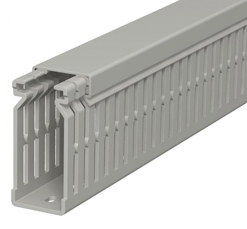 Verdrahtungskanal inkl. Oberteil und Bodenlochung zur waagerechten und senkrechten Verlegung elektrischer Kabel und Leitungen im Schaltschrank. Ausführung als metrischer Kanal. Das Nennmaß der Systemgröße entspricht dem Innenmaß der Kanäle. Das Ausbrechen der Stege erfolgt werkzeuglos. Bodenbündiges Ausführen ist durch Sollbruchstellen möglich. Verjüngungen in den Seitenschlitzen verhindern das Herausfallen der Leitungen. Geprüft nach DIN EN 50085-2-3. Sonderlängen auf Anfrage.