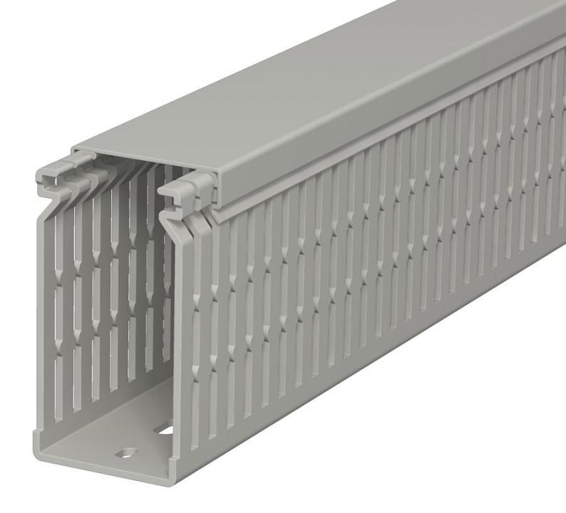 Verdrahtungskanal inkl. Oberteil und Bodenlochung zur waagerechten und senkrechten Verlegung elektrischer Kabel und Leitungen im Schaltschrank. Ausführung als metrischer Kanal. Das Nennmaß der Systemgröße entspricht dem Innenmaß der Kanäle. Das Ausbrechen der Stege erfolgt werkzeuglos. Bodenbündiges Ausführen ist durch Sollbruchstellen möglich. Verjüngungen in den Seitenschlitzen verhindern das Herausfallen der Leitungen. Geprüft nach DIN EN 50085-2-3. Sonderlängen auf Anfrage.
