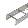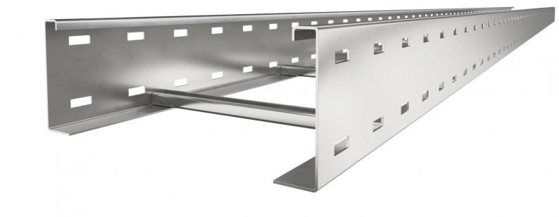 Weitspann-Kabelleiter mit gelochtem Seitenholm in 110 mm Seitenhöhe. Befestigung von Kabeln und Leitungen mit Bügelschelle Typ 2056.