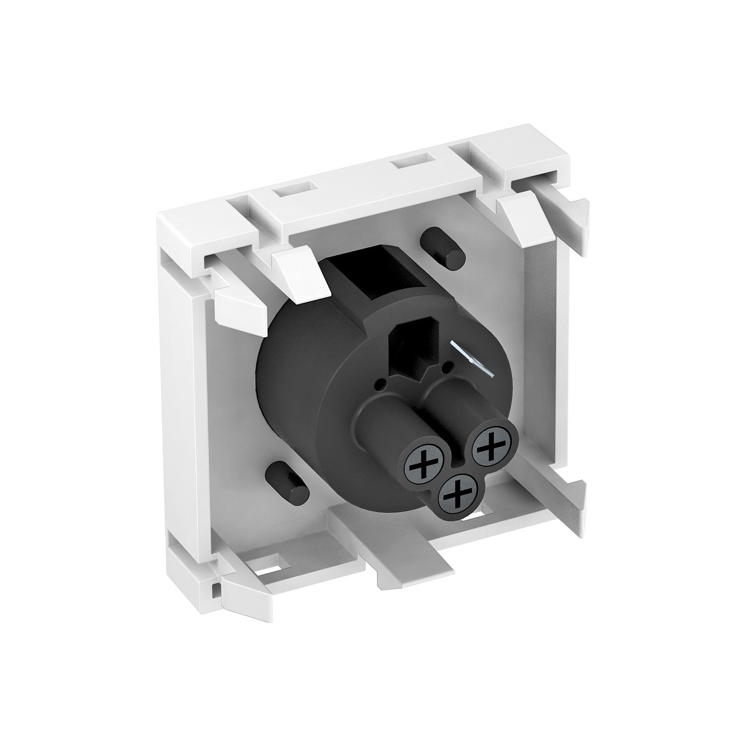 Multimediaträger mit einer XLR-Anschlussbuchse, Kabelauslass gerade, ohne Beschriftungsfeld, XLR-Stecker 3-polig mit Schraubanschluss. Trägerplatte mit Rastbefestigung, geeignet für den waagerechten und senkrechten Einbau in die Systemumgebung.